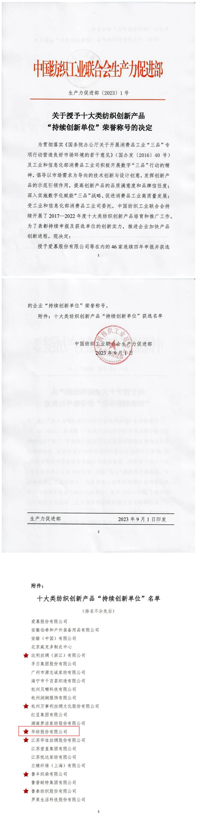 為表彰持續申報及獲選單位的創新實力,推進企業加快產品創新進程。近日,中國紡織工業聯合會生產力促進部發布“關于十大類紡織創新產品‘持續創新單位’榮譽稱號的決定”,授予華紡股份有限公司等在內的46家連續四年申報并獲選的企業“持續創新單位”榮譽稱號。