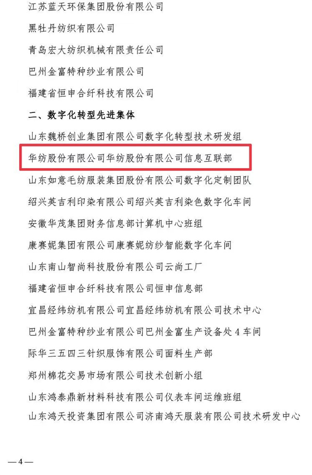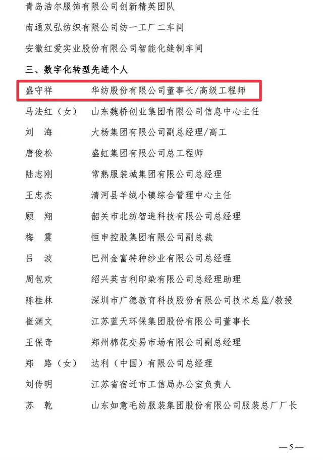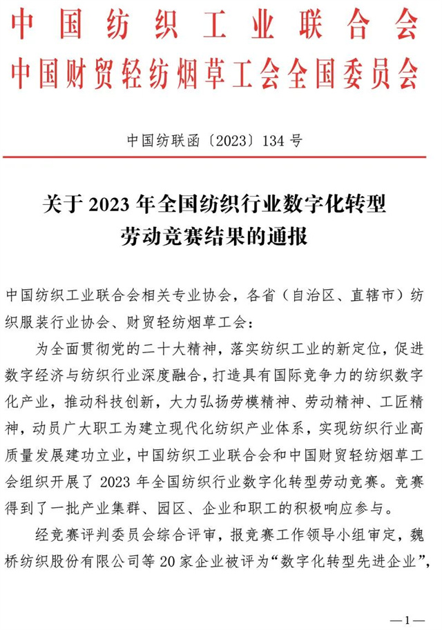 近日,中國紡織工業(yè)聯(lián)合會、中國財貿(mào)輕紡煙草工會全國委員會聯(lián)合發(fā)布了《關(guān)于2023年全國紡織行業(yè)數(shù)字化轉(zhuǎn)型勞動競賽結(jié)果的通報》,公司憑借2023年在數(shù)字化轉(zhuǎn)型方面的不斷探索與創(chuàng)新被評為“數(shù)字化轉(zhuǎn)型先進(jìn)企業(yè)”,公司信息互聯(lián)部被評為“數(shù)字化轉(zhuǎn)型先進(jìn)集體”,公司黨委書記、董事長盛守祥先生被評為“數(shù)字化轉(zhuǎn)型先進(jìn)個人”。